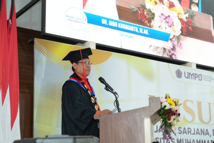Rektor UMPO, Dr. Rido Kurnianto, dalam sambutannya menyampaikan rasa syukur atas pencapaian kampus yang semakin menunjukkan kiprah unggul di dunia pendidikan tinggi.